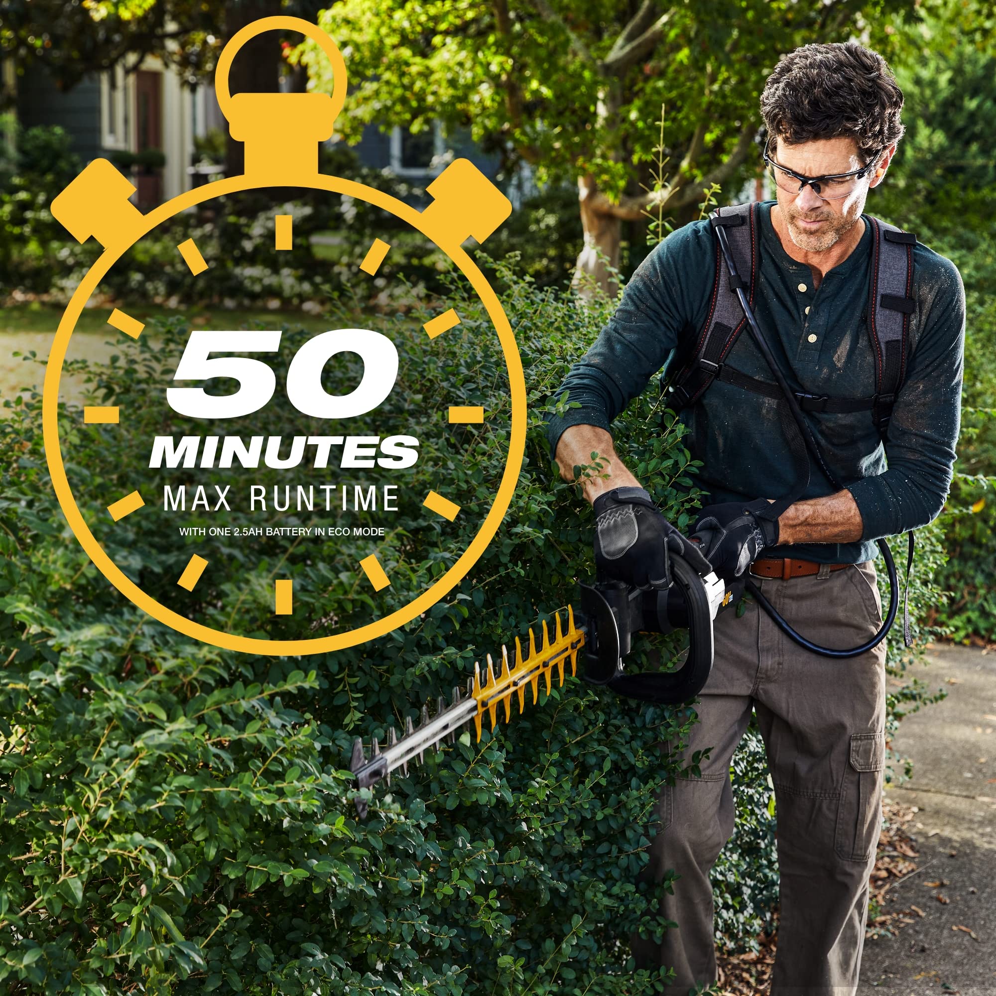 - HIGH-PERFORMANCE HEDGE TRIMMER: Sculpt and trim numerous shrubs with gas-like power and refined speed control. Work without being weighed down using the ergonomic backpack design that keeps battery weight off your arms